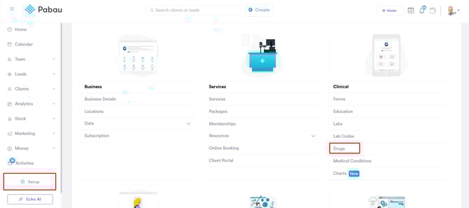 Start by logging in to your Pabau account using your login credentials. Then navigate to the Setup page in the left sidebar menu. Under the Clinical section, you will find the Drugs tab.