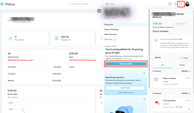 When Stripe determines your clinic is eligible, you’ll see a Stripe Capital banner or notification when opening your Wallet at the top right corner of the screen.