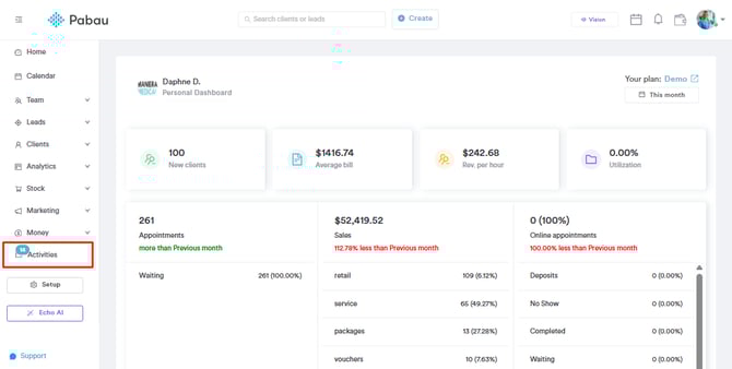 Start by logging into your Pabau account using your login credentials. Then, navigate to the left sidebar menu and click the "Activities" tab. This action will lead you to the Activities page.