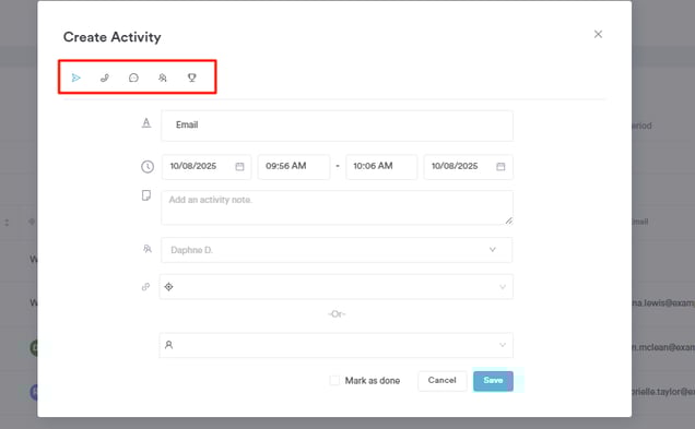 Here you can proceed to select the activity type by clicking the icons listed at the top. To find out how you can create activity types, refer to this guide.