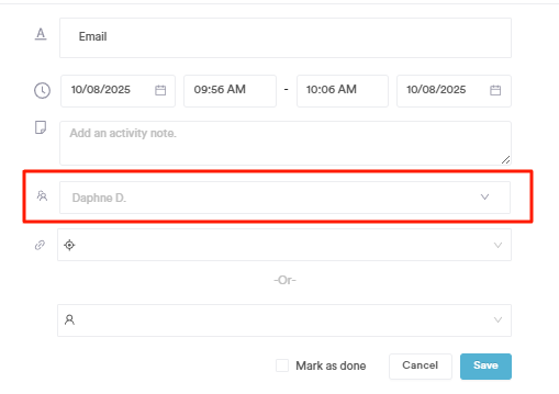 By default, the staff member creating the activity will be selected in the "Assigned to" field. To assign it to someone else, click the field and choose from the dropdown list of all staff members.