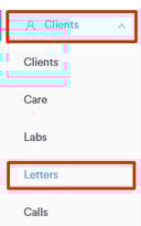 Navigate to the "Clients" tab on the left sidebar menu and click to expand it. Then, click on the "Letters" sub-tab that appears.