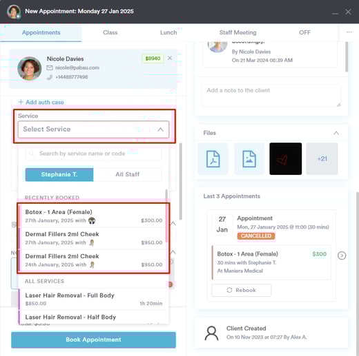 Select the service for the appointment. You can either scroll through the options or use the search bar to find a service by name. At the top of the service selection modal, you'll see the three most recently booked services by the client, which you can select to quickly book.