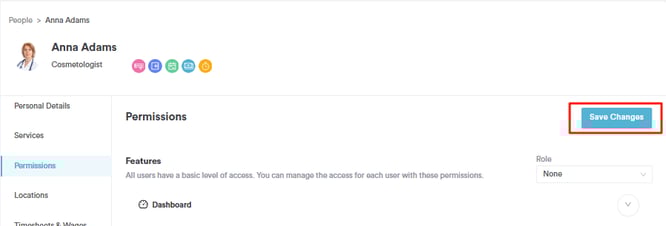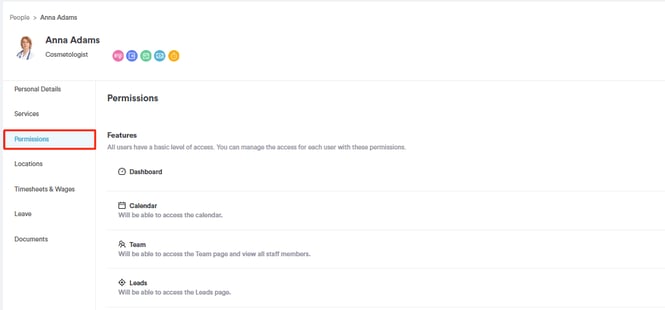 Select a staff member to view their profile details. Then, switch to the "Permissions" tab to manage their permissions.