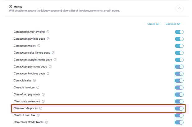 Scroll down through permissions and click to expand the "Money" section. This will reveal the "Can override prices" permission.