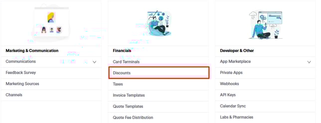 Now, navigate to the Setup page by clicking the Setup button located at the bottom of the left sidebar menu. You'll find the "Discounts" tab under the Financials section.
