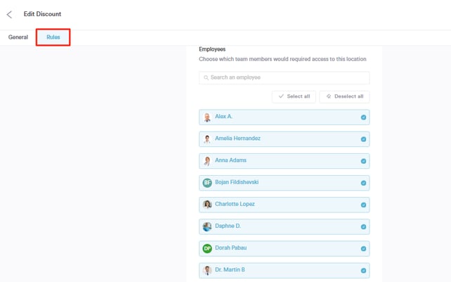 Open the discount you want to edit or click Create New Discount. Under the Rules tab, scroll down to find the Employee section and proceed to select the specific staff members who should have access to this discount.