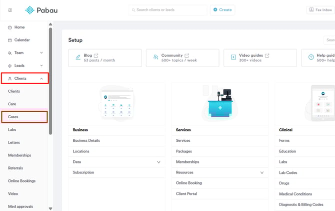 Start by logging into your Pabau account using your login credentials. Then, navigate to the left sidebar menu and click the 'Clients' tab to expand it. This will reveal the 'Cases' sub-tab.