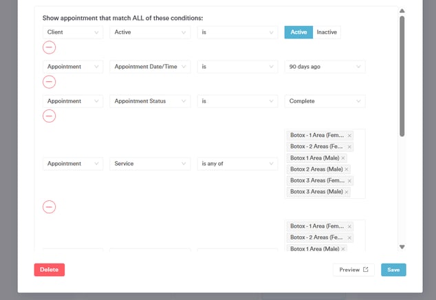 - Client last appointment (date) is 90 days ago.