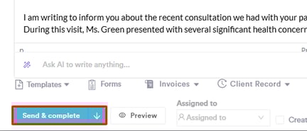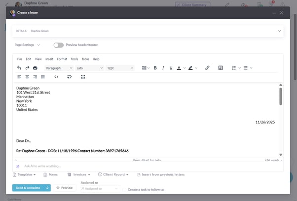 You can make edits if needed, ensuring the letter reflects the treatment notes correctly. Once satisfied, save the letter by clicking the "Send & Complete" button in the bottom left corner.