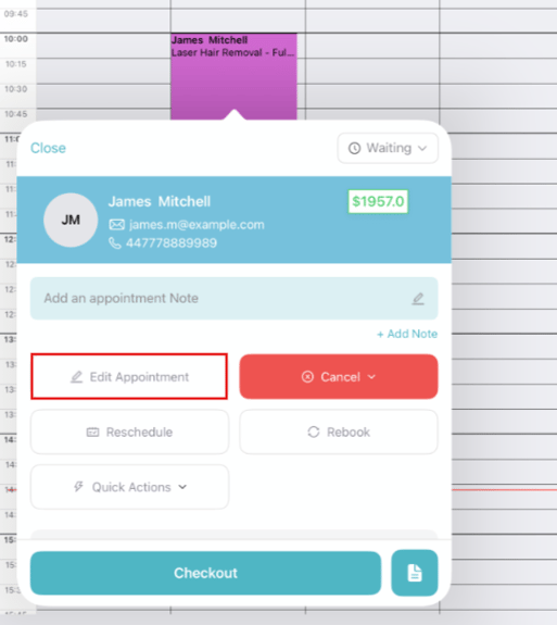 - Change Service: Press on the existing service name to select a different one, or change the duration of the booked service.