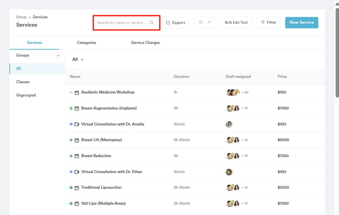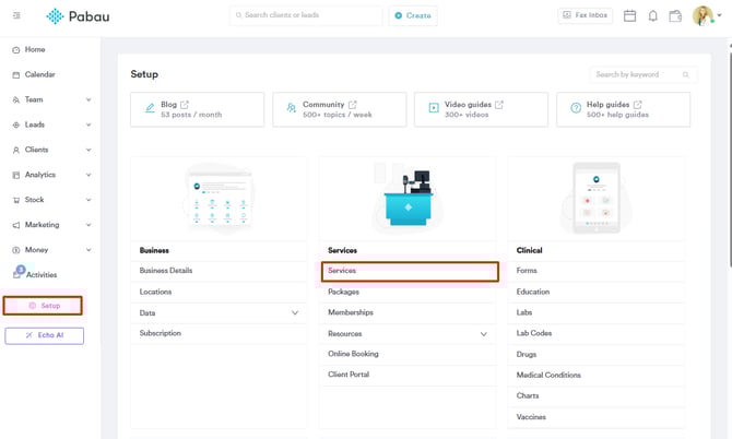 Start by logging into your Pabau account using your login credentials. Then, navigate to the Setup page. Under the Services section, go to the "Services" tab to view all the services you’ve created.