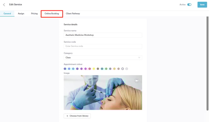 Click on a service to open the Edit Service modal, then switch to the Online Bookings tab.