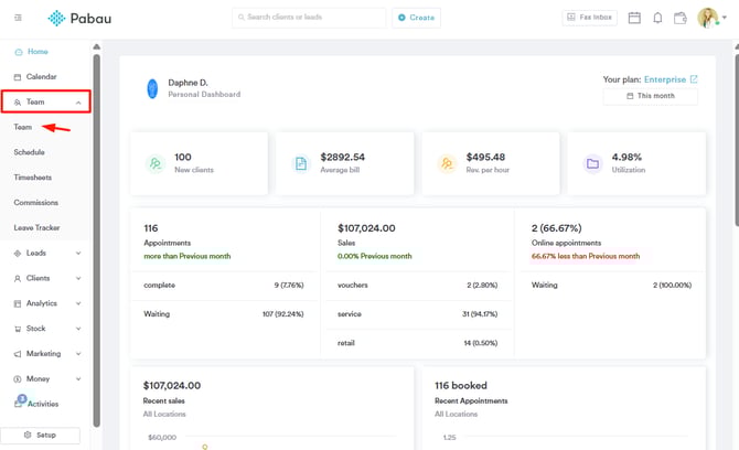Start by logging into your Pabau account using your login credentials. Then, navigate to the Team tab located on the left sidebar menu. Click to expand and click "Team" again.