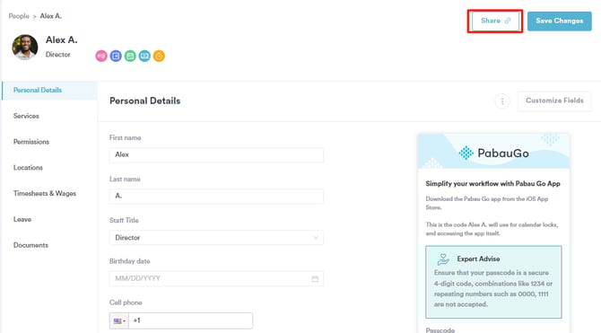 On the staff member’s profile, you’ll find the booking link at the top right corner of the screen. Click the "Share" button to access more actions.