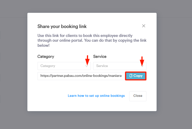 A pop-up window will appear, allowing you to pre-select only the staff member and click "Copy." This will allow the client to select all other details while keeping the chosen staff member fixed.