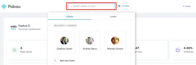 Start by logging into your Pabau account using your login credentials. Then, navigate to the search bar at the top of the screen and begin to type the client's name for quick access. The client profile will appear on the search results. Click to access their client card.
