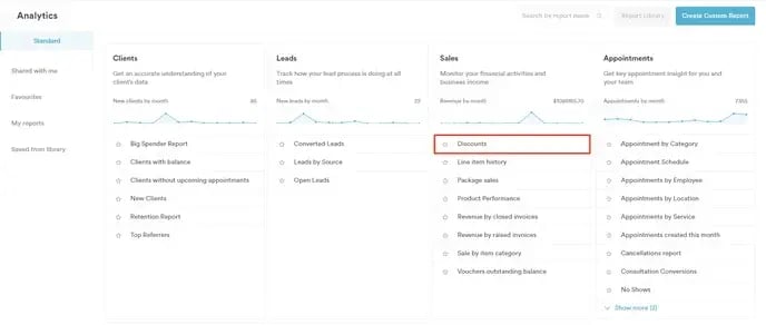 Under the 'Sales' section, you will find the Discounts pre-created report. Click on the report name to continue.
