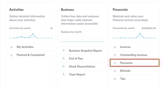 Under the 'Financials' section, you will find the Payments pre-created report. Click on the report name to continue.