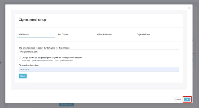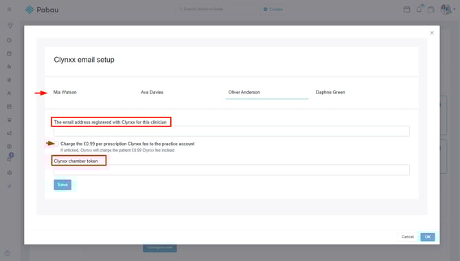 Below, you can enter the email address registered with Clynxx for the selected clinician, choose whether to charge the £0.99 Clynxx fee to the practice account or the patient, and add the Clynxx chamber token.