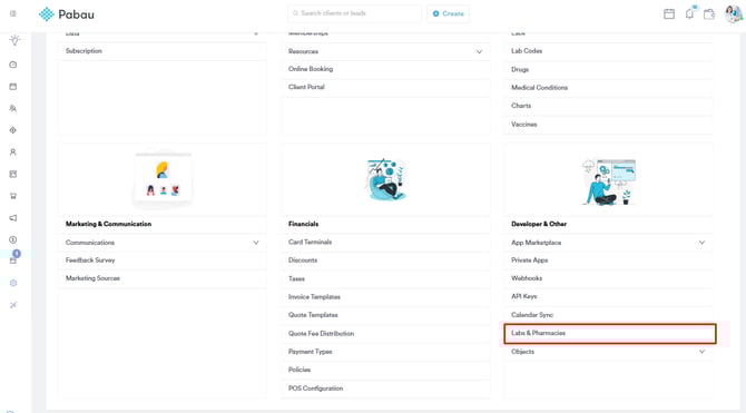 Start by logging into your Pabau account using your login credentials. Then, click the 'Setup' button at the bottom of the left sidebar menu. On the Developer & Other section, find the Labs & Pharmacies tab.