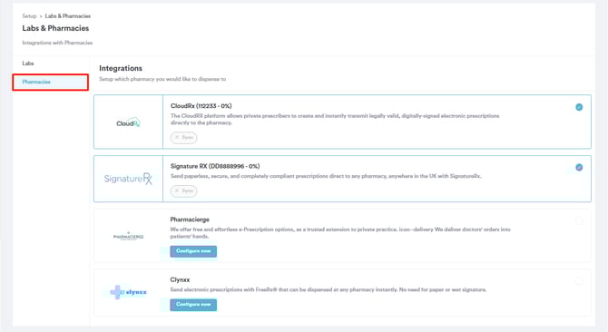 After opening the Labs & Pharmacies page, go to the 'Pharmacies' tab to see the available pharmacy integrations.