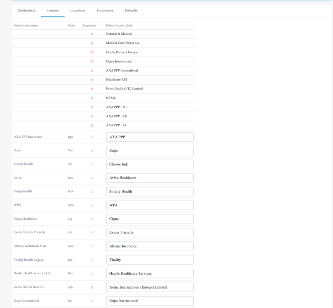 In the Insurers tab, you will see a list of insurers from your Healthcode account on the left and insurers from your Pabau account on the right.
