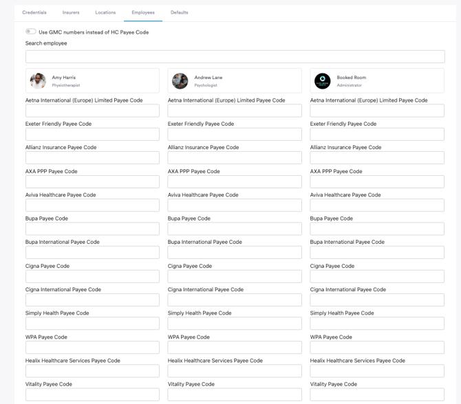 Navigate to the Employees tab. Ensure that you have added a GMC number to each clinician in Team > Personal Details as this is transmitted to Healthcode for each invoice and is required by Healthcode to allow them to identify the clinician.