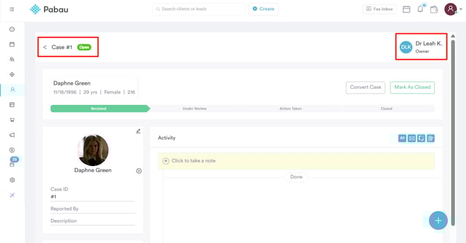 When you open a case, you’ll get a full view of its details. The case number appears at the top left, and the case owner is shown at the top right of the screen.