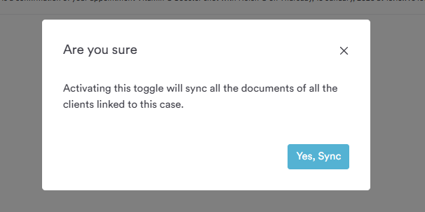 A confirmation pop-up will appear, as activating this option will sync all documents linked to the case.