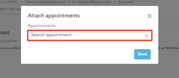 A pop-up window will appear where you can search for relevant appointments by clicking the Search appointment field. A dropdown will display all appointments for that client—simply select the one you want to link.