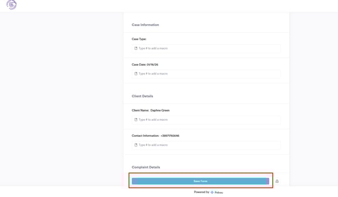 Clicking the form will redirect you to a new page where you can fill out the case information. Once you’ve entered all the details, click 'Save Form' to finalize.