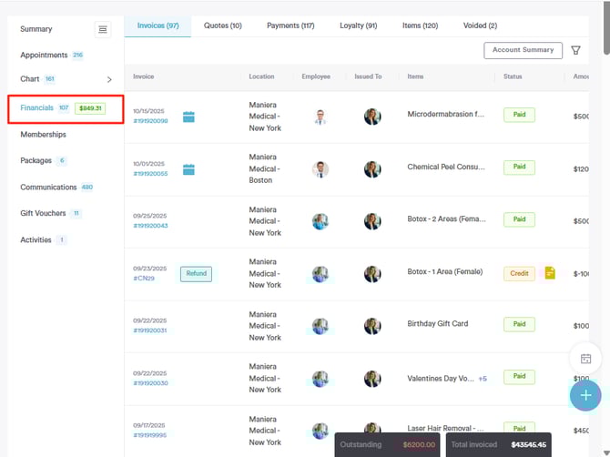 After selecting the client, in the client card you will find the "Financials" tab. This tab contains a record of all payments made by the client.