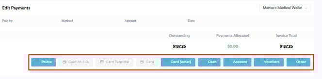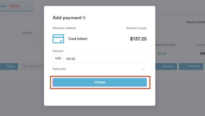 If the invoice hasn’t been paid yet, you’ll only see the outstanding balance. To process a payment, select the method the client wants to use — such as Card or Cash. A pop-up window will appear where you can enter the amount the client wishes to pay.