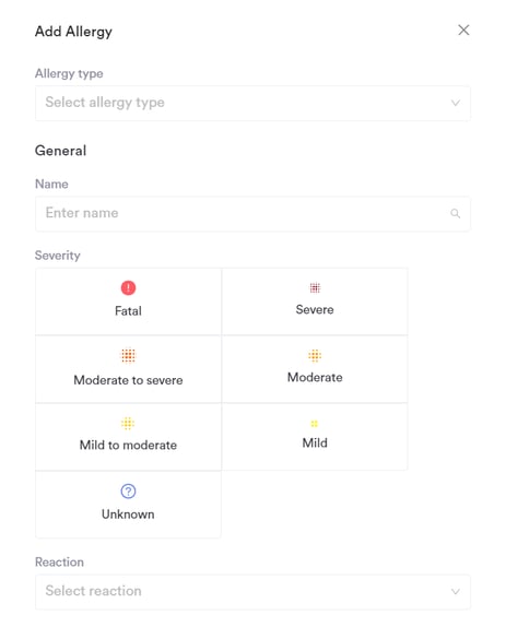 Upon clicking, you will be prompted to add the necessary details regarding the allergy, such as the allergy type, the severity of the allergy, and its reaction.