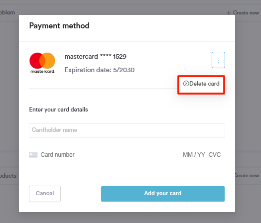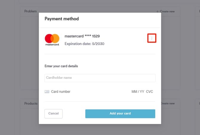 Clicking the card icon opens a pop-up window where you can view the client’s saved card or add a new one. Click the three dots located on the right side of the card details to reveal the available actions.