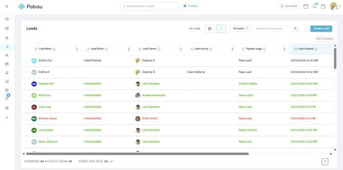 Log into your Pabau account and click on Leads in the left sidebar menu. This will open your leads list showing all current leads and enquiries in your pipeline.