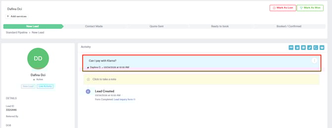 Inside the Lead Card, you can view the details of the inquiry that was submitted — including any message the lead left, their contact details, and the source of the inquiry. Review this information so you have the full context before responding.