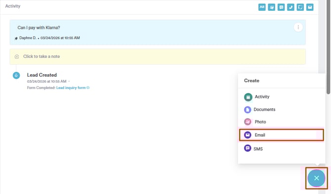To send an email to the lead, click the Create button on the Lead Card. From the options that appear, select Email.