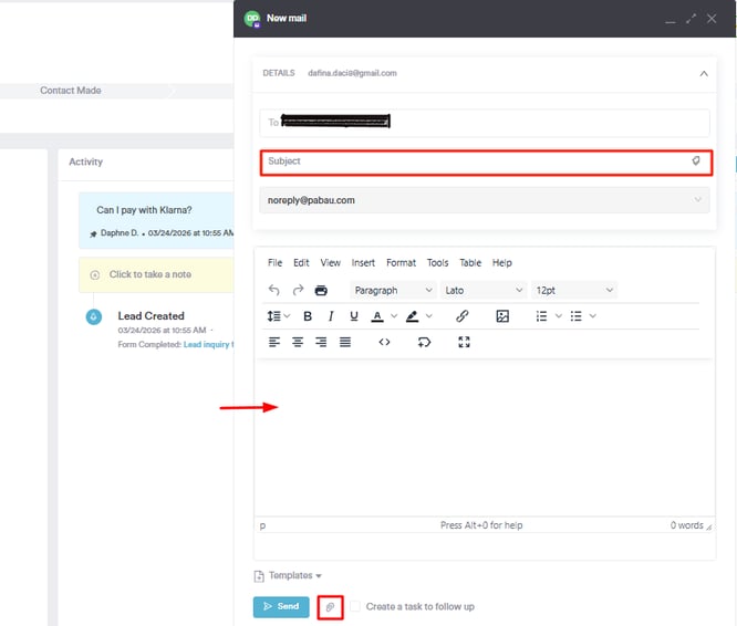 Once you are happy with your message, click Send. The email will be sent directly to the lead's email address and logged on their Lead Card so your team has a full record of all communication in one place.