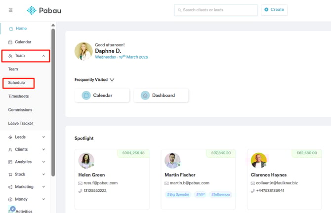 Log into your Pabau account and navigate to Team in the left sidebar menu. Click on Scheduler to open the scheduling view.