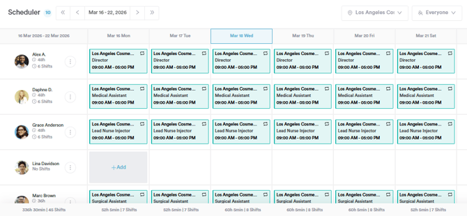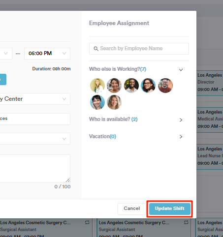 Click on an existing shift to edit it, or create a new one by clicking the relevant day and staff member slot. This will open the Create Schedule modal.