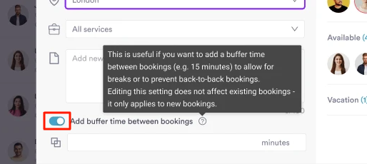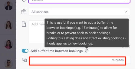 NOTE: Buffer time only applies to new bookings once it's set up. Existing appointments and their schedules will not be affected when you add or change a buffer setting.