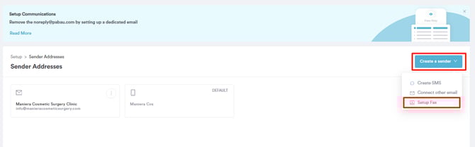 - Click the "Create a sender" button at the top right corner and click "Setup Fax."