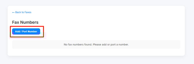 Here you can purchase or add a fax number that will be used as your “Fax as” sender ID when sending faxes. A window will open where you can add a fax number. Click the "Add/Port Number" button to get started.