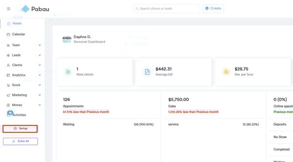 Start by logging into your Pabau account using your login credentials. Then, navigate to the Setup page located at the bottom of the left sidebar menu.