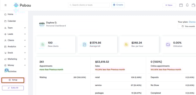 Start by logging into your Pabau account using your login credentials. Then, navigate to the Setup page by clicking the "Setup" button located in the bottom left corner of the screen.