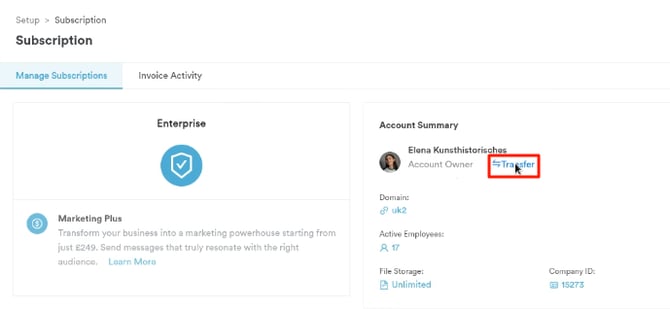 If you are set as the owner of the account, you'll view your name under the "Account Summary" section. Next to your name, you'll view the "Transfer" button. Click to continue.