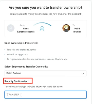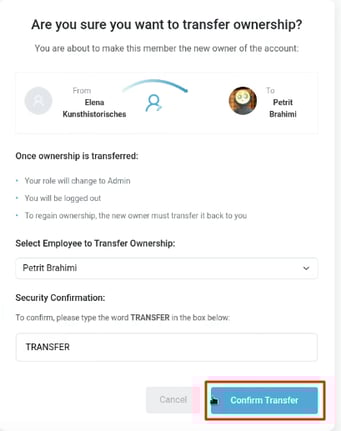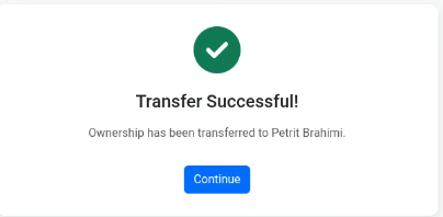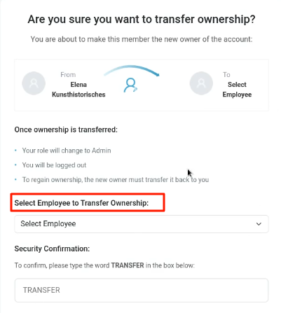 Upon clicking the "Transfer" button, the Transfer Ownership page. Select the employee you want to transfer ownership to.