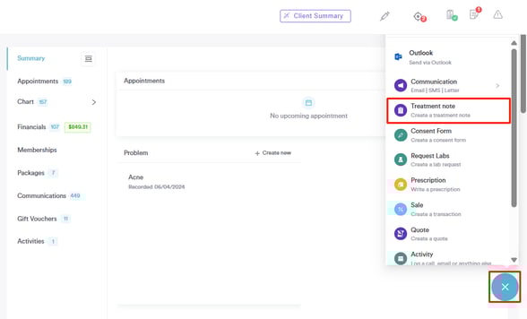 Click the "Create" button located in the bottom right corner of the screen. This will reveal the "Write a treatment note" option.